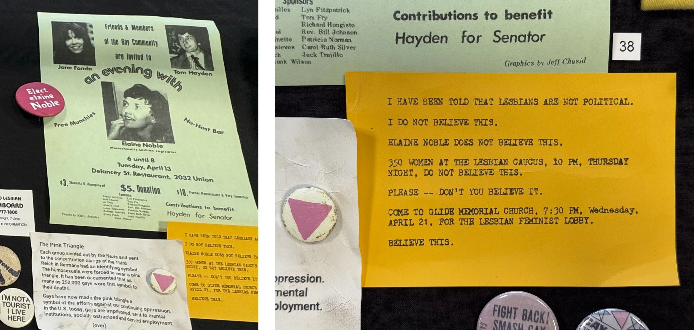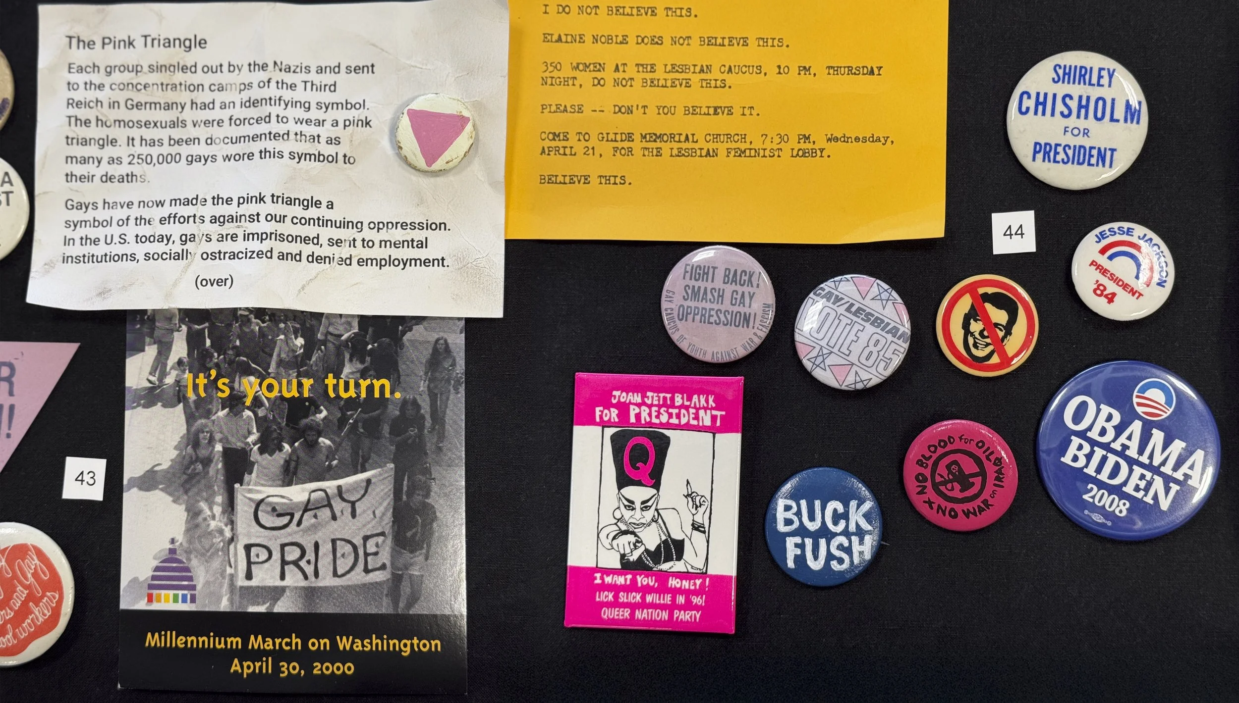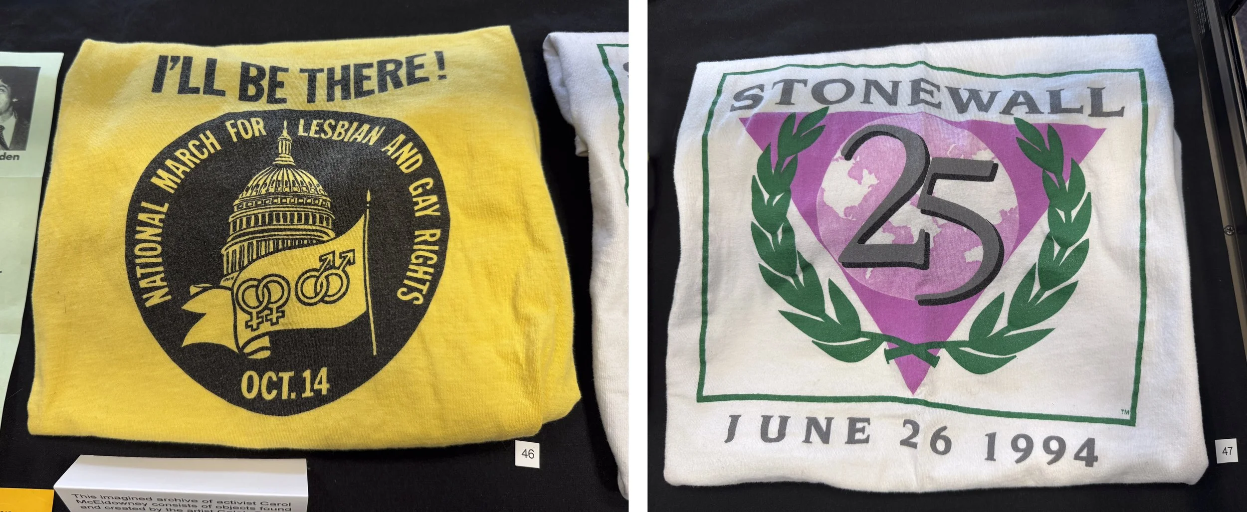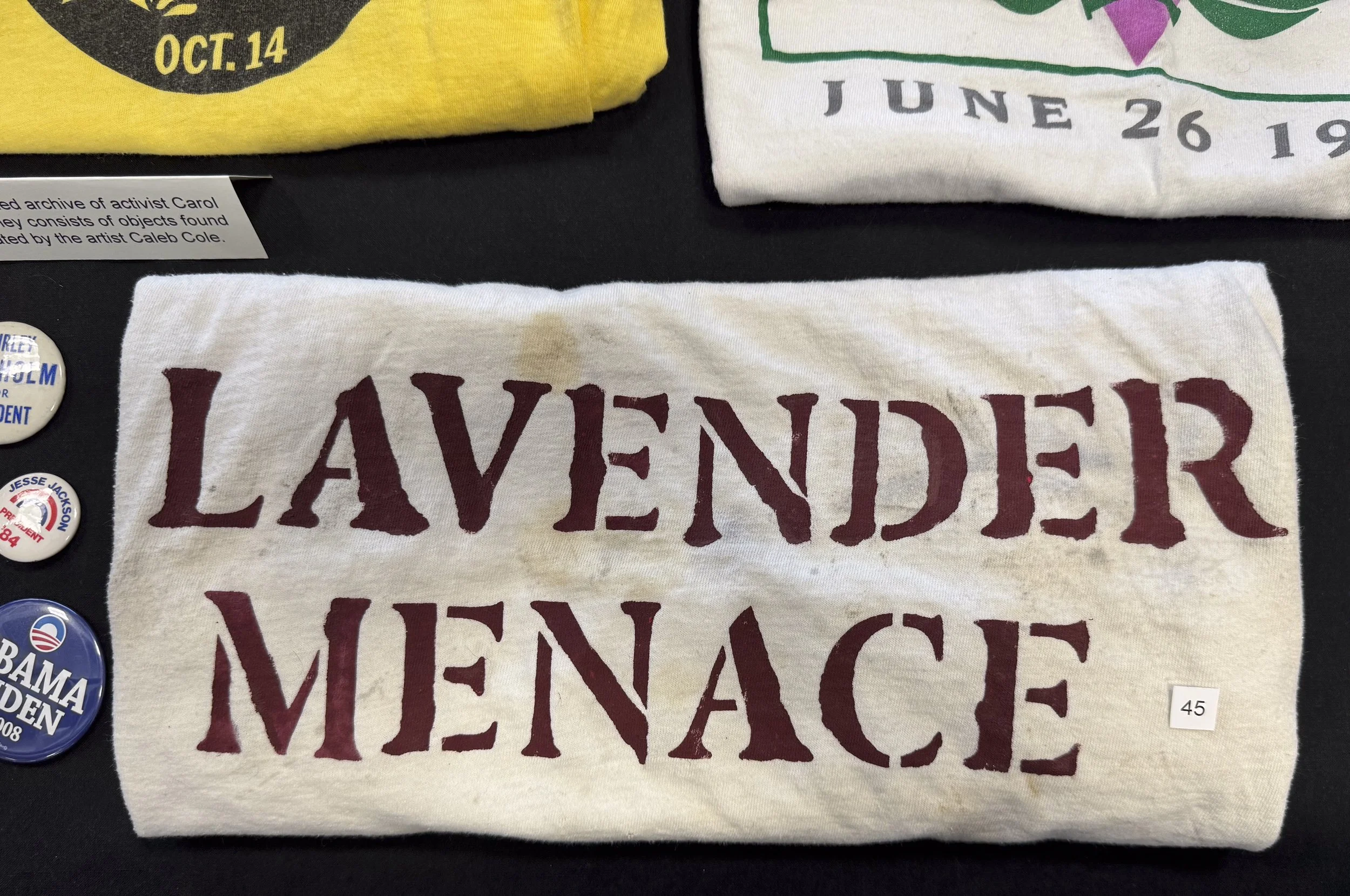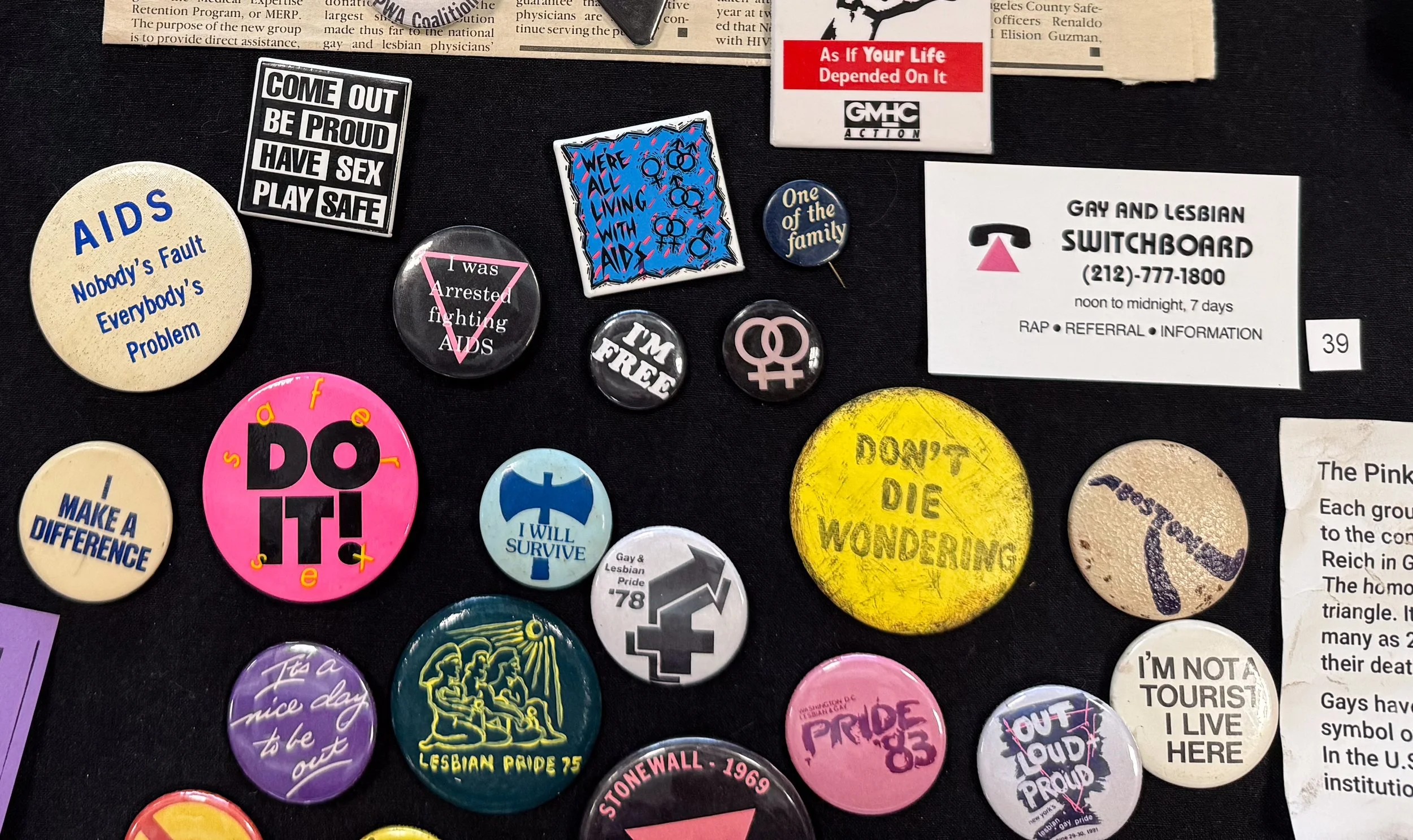 Carol’s pinback button collection reflects the many events and issues that were important to her. Besides her buttons (which are on loan from the Lesbian Herstory Archives), her extensive collection of flyers, cards, and other ephemera trace various volunteer efforts (for example, briefly volunteering with the Gay and Lesbian Switchboard of New York).