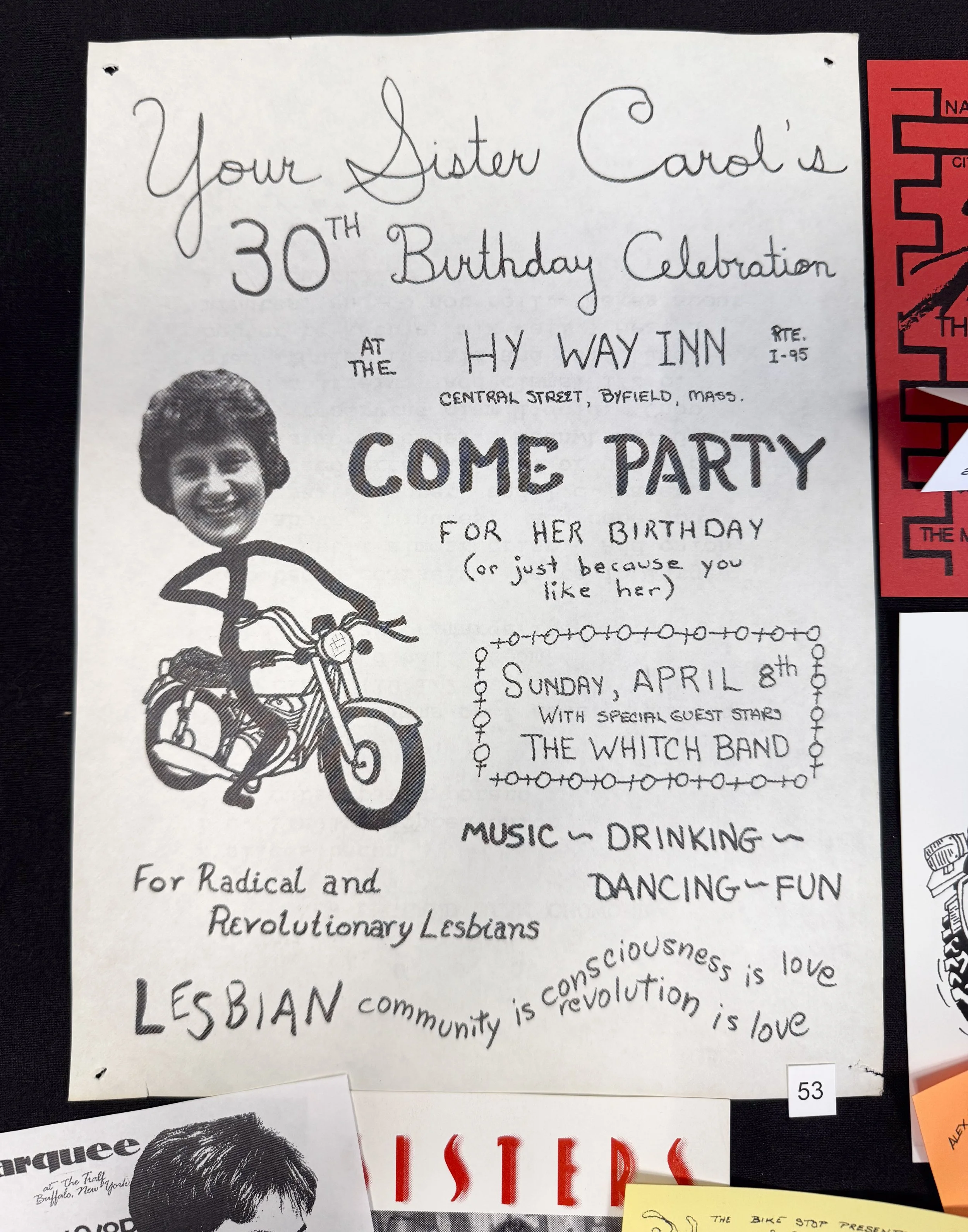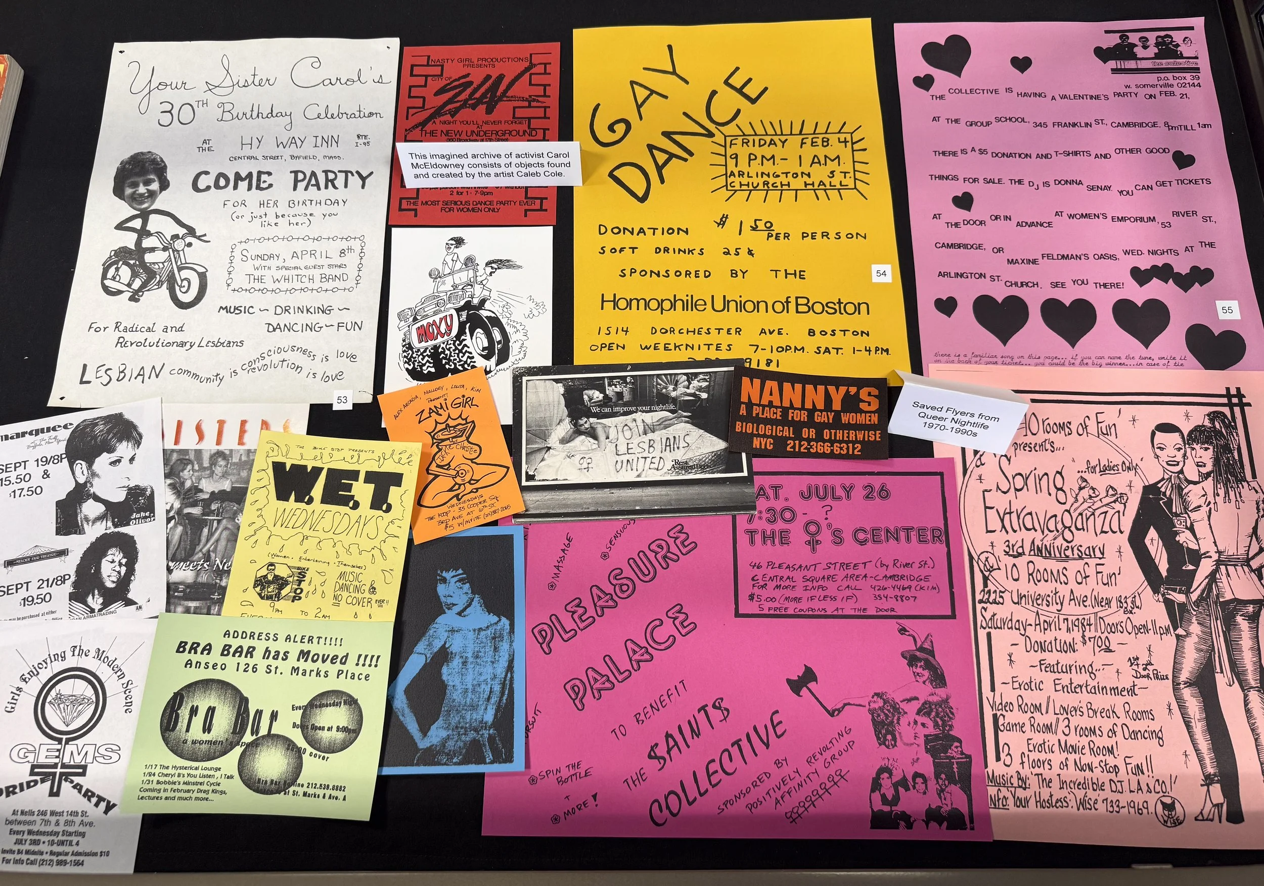 Carol has been collecting bar, club, and party flyers since 1969. This represents only a very small selection; the rest are currently in the Lesbian Herstory Archives Bar files (for primarily NYC locations) or at Queer History Boston (for MA locales), where she was an early contributor.