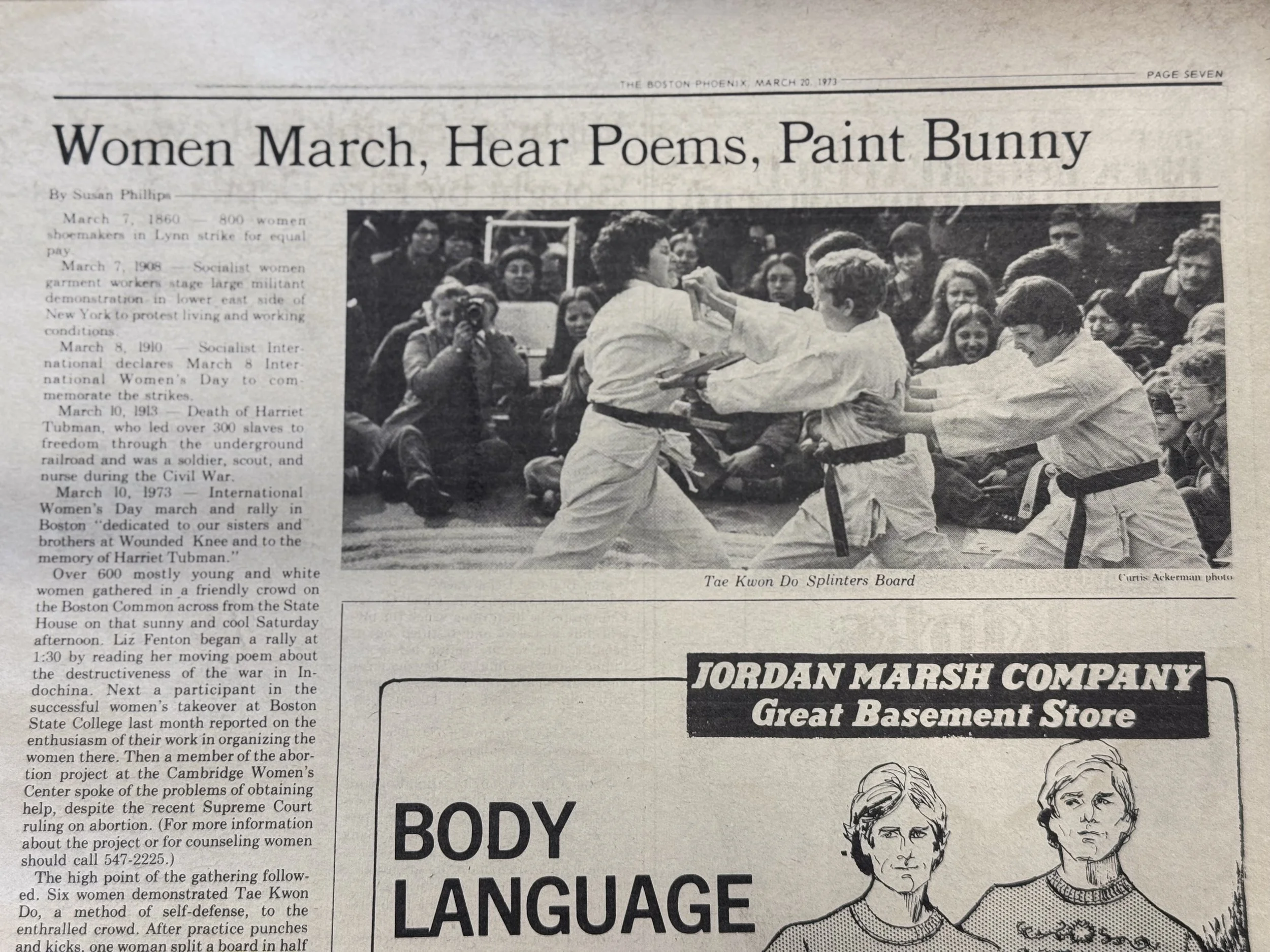 Susan Phillips of The Boston Phoenix explains that “[t]he high point of the gathering followed. Six women demonstrated Tae Kwon Do, a method of self-defense, to the enthralled crowd. After practice punches and kicks, one woman split a board in half with her elbow; another split a board with her foot. A third woman attempted with her fist but only dented the board and bruised her knuckles. Women in the crowd cheered a double side kick — each probably’ imagining the pain in the groin to that would-be rapist” Boston Phoenix, March 20, 1973, p. 7. Read the entire article here.