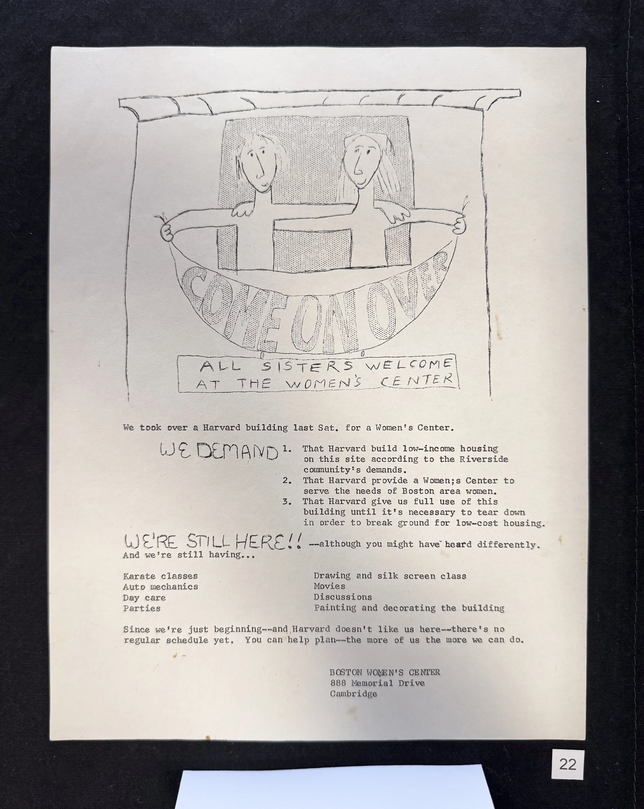 Carol was a participant in the “1971 takeover and occupation of a Harvard University-owned building by hundreds of Boston area women. The ten-day occupation of 888 Memorial Drive by women demanding a Women’s Center and low income housing for the community in which the building stood, embodied within it many of the hopes, triumphs, conflicts and tensions of Second Wave feminism. One of the few such takeovers by women for women, this action was transformative for the participants, and led directly to the establishment of the longest continuously operating Women's Center in the U.S.” (leftonpearl.org)