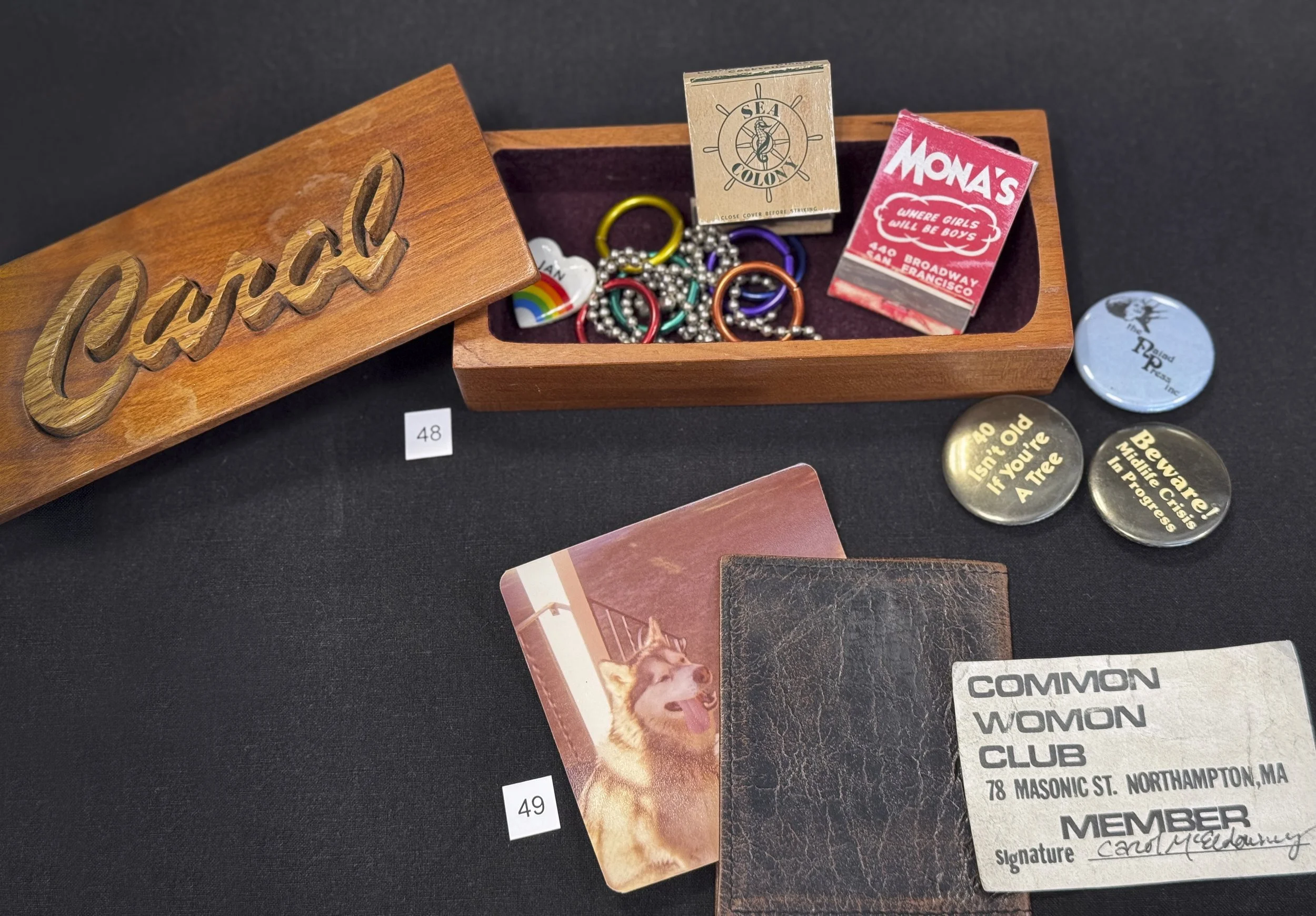 This small personalized wooden box, made by a friend, has held an assortment of personal items, such as matchbooks from lesbian bars (some with women’s numbers inside), freedom rings from the 1990s, and a pin from an ex-lover, Jan.
