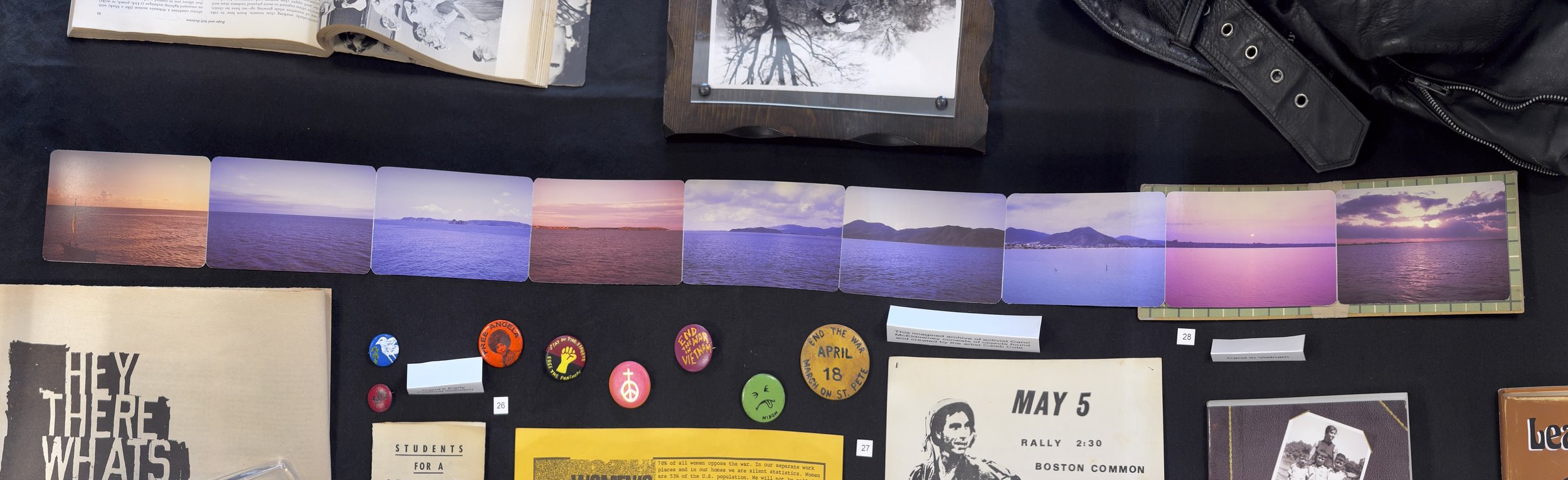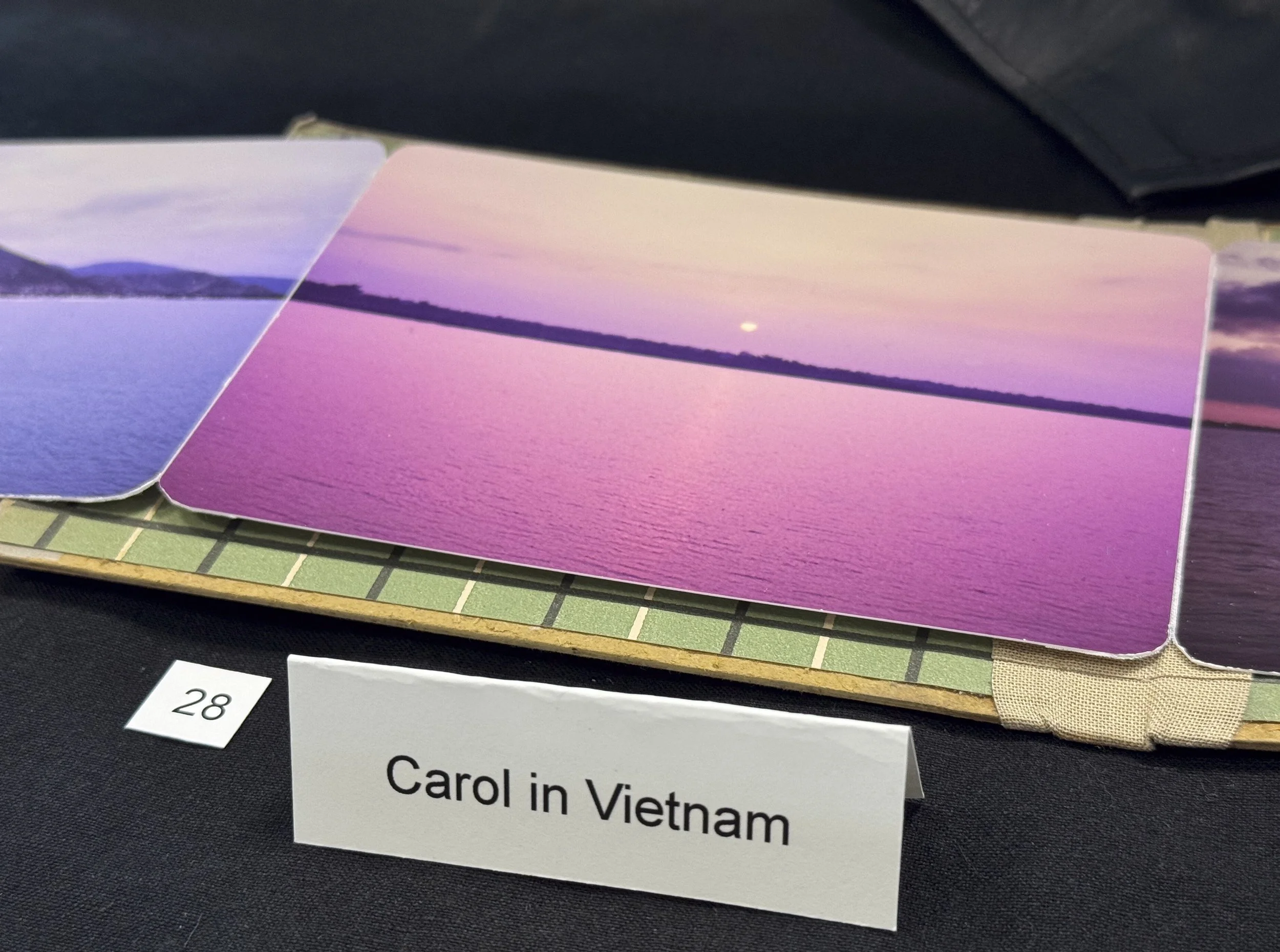 In 1967, Carol “was one of only two women in a small contingent from the United States to travel to Vietnam. The purpose of this trip was to study Vietnamese society and the consequences of this war upon it, in order to further the goals of those fighting "back home," (in the U.S.), to end the war” (UMB Archives Collection Overview). She recorded her thoughts about the trip in a journal (see #29 below) and made photographs of her journey (see “Photography, 1956-1973, Carton: 6, Folder: 14” for her other photographs). Upon return, Carol created this handmade book linking together the various horizons she photographed in Vietnam while ruminating on possible peaceful futures for the country and for the world.