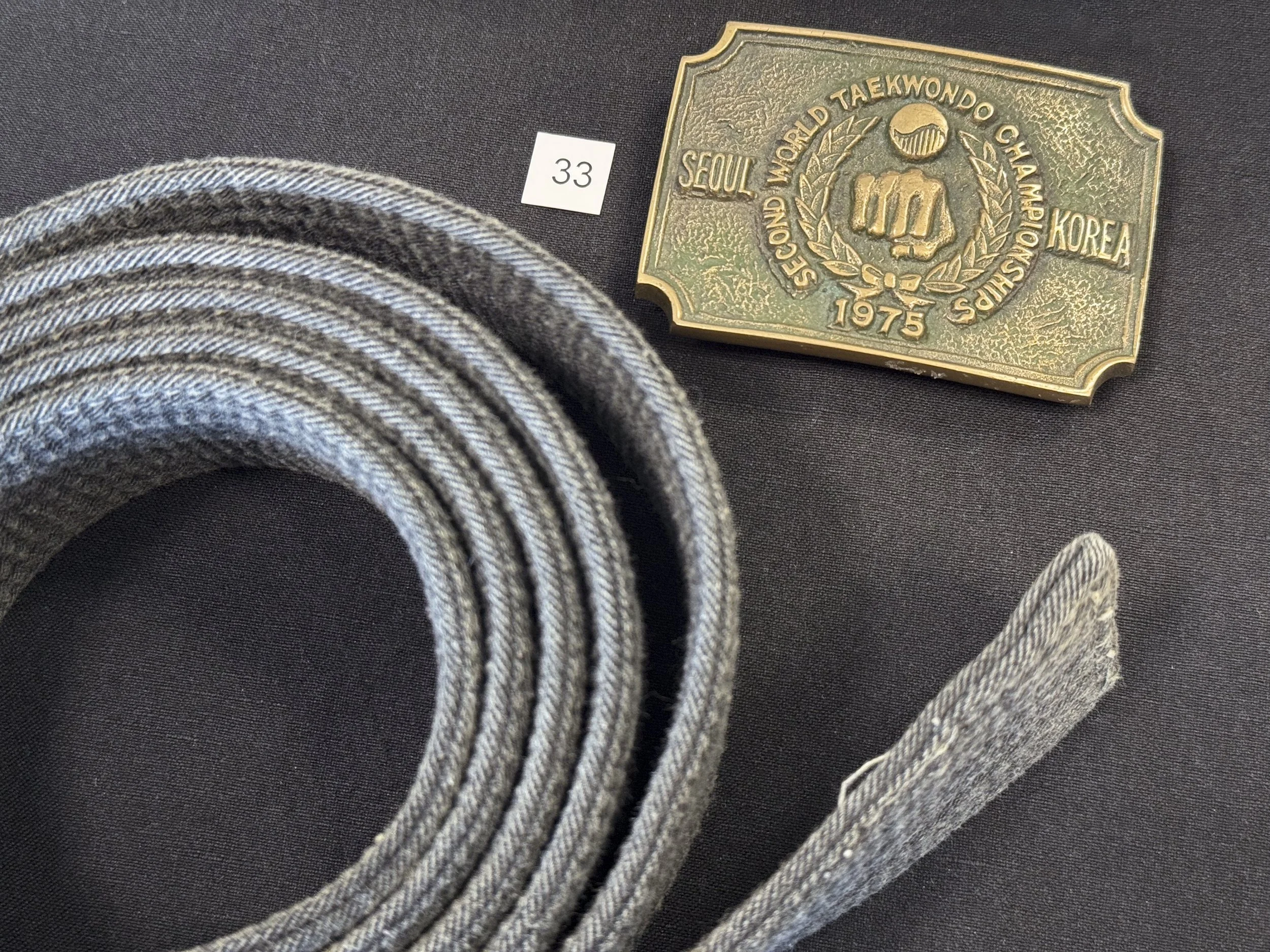 Carol was both teaching martial arts to other women and working her way through Tae Kwon Do belts during the course of her journals. She explains that “even though it conflicts with my politics, I'm into the belt/ranking trip because the straight world operates along those lines of status. I have more credibility if I can flash a blue belt at some place that's thinking of hiring me [than I could with a green belt]” (p. 128 COJ). She really wanted to achieve black belt status: “I attended a Tae Kwon Do demonstration the other day— impressive beyond description— and I'm feeling inspired about working really hard. Could I get a black belt in less than 2 years[?]” (p. 90 MCJ). Pictured is a commemorative belt buckle from the Second World Tae Kwon Do Championships in 1975 and the black belt that Carol finally earned, faded and worn from many many more years of teaching and fighting.