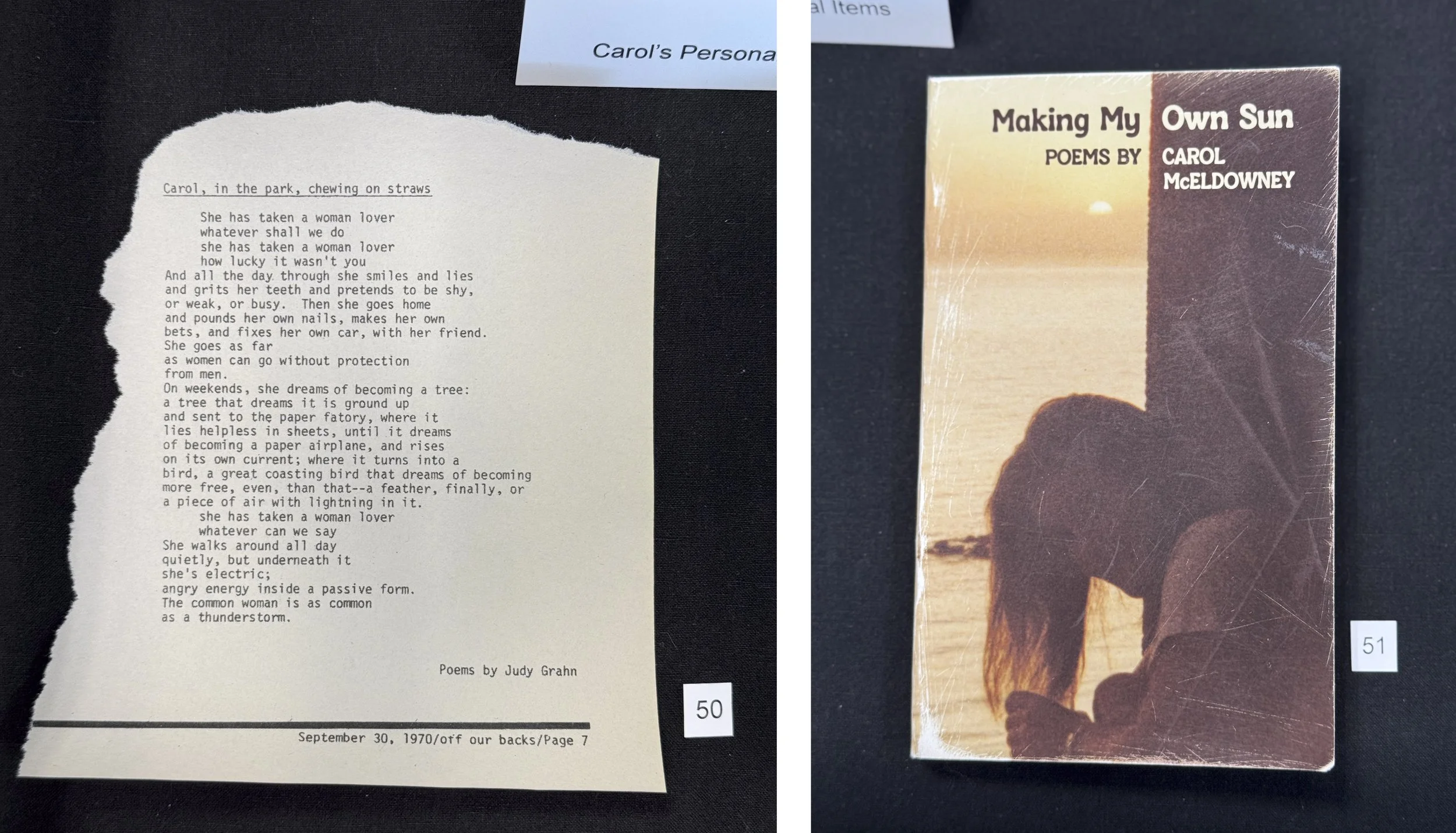 Carol wrote her own poetry, some of which has been published in lesbian feminist newspapers as well as journals like Common Lives/Lesbian Lives. She also published a book of poetry in 1976, Making My Own Sun, drawing from and expanding on those in the Coming Out Journal and the Multicolored Journal. The title comes from the 1971 poem in her Coming Out Journal (p.52):
